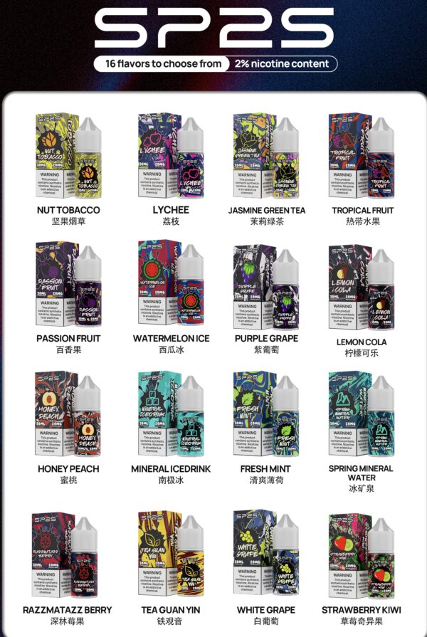 為跟進市場的脚步 .全新推出一款30ml的煙油 .多種口味選擇 .無論您是喜歡水果清甜還是芬香茶味 .SP2S煙油都能給您帶來滿意的vape體驗。